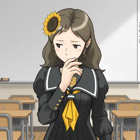 校服:黑色水手服,黑色裙子,校服,向日葵发饰,黄色领结