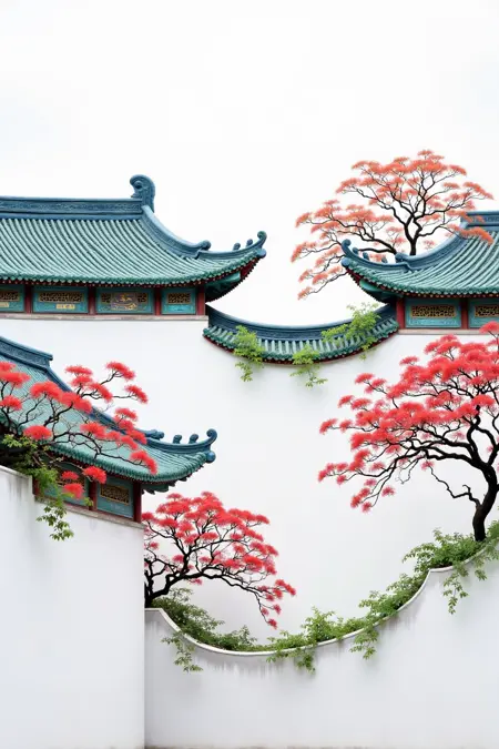 伝統的な中国建築の要素、白い壁、青緑色の屋根、赤い花の枝が咲き、鮮やかな古代風の景色を創出。
