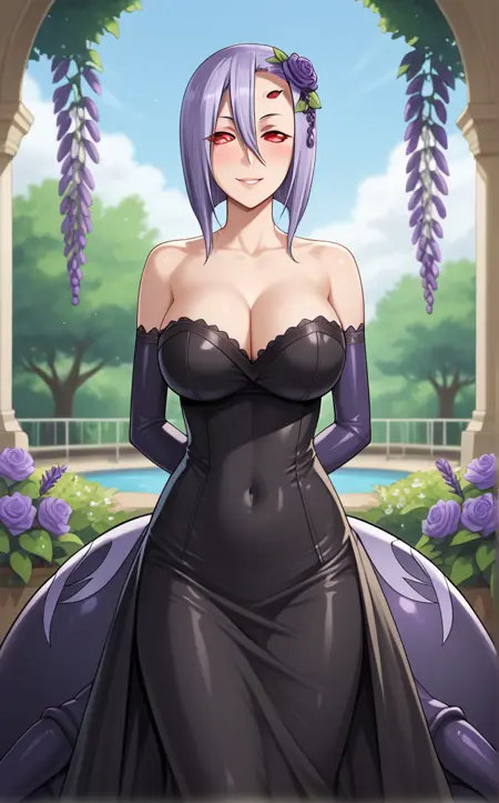 BlackWeddingDress_RachneraArachnera_ownwaifu, 1girl, arachne, arthropod girl, bare shoulders, black gloves, carapace, collarbone, elbow gloves, extra eyes, furry, hair between eyes, hair flower, hair ornament, light purple hair, monster girl, purple flower, red eyes, short hair, spider girl, taur, cleavage, multiple legs, official alternate costume, black dress, large breasts, purple rose, wedding dress, covered navel, solid eyes, strapless, flower ornament, strapless dress,