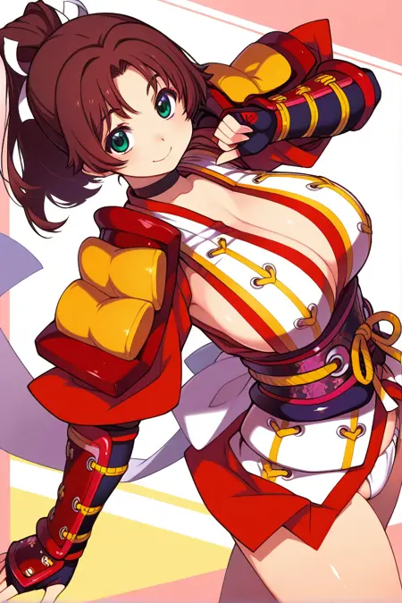 Onigashimakazari, full colour, 1girl, ribbon, green eyes, brown hair, ponytail, huge breasts, choker, japanese armor, shoulder_armor, armor, japanese clothes, fundoshi, kote, sash, toeless legwear,