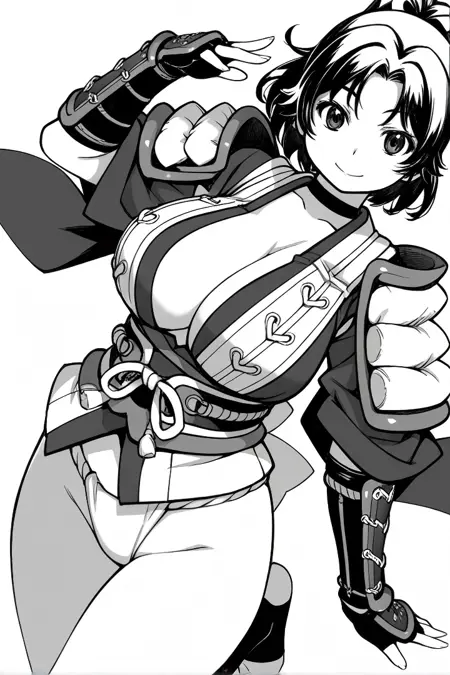 Onigashimakazari, greyscale, ponytail, 1girl, huge breasts, choker, japanese armor, shoulder_armor, armor, japanese clothes, fundoshi, kote, sash, toeless legwear,