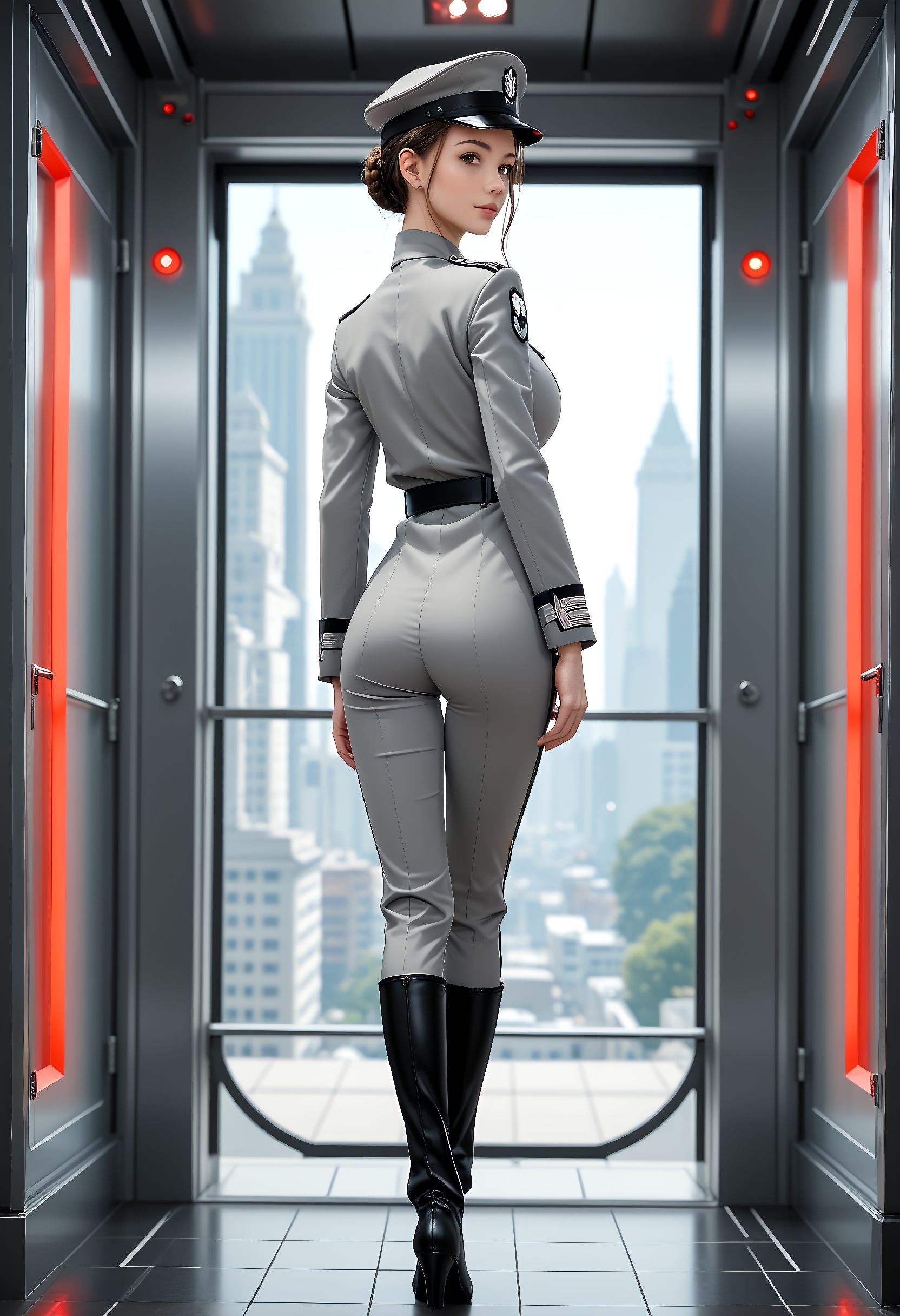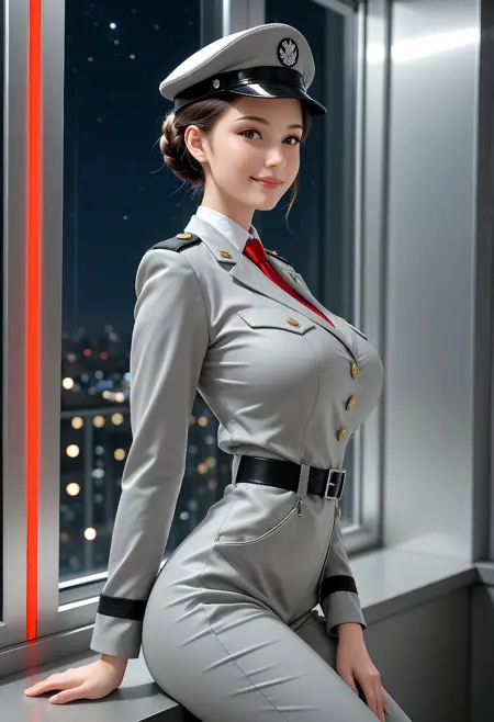 D025、(色)軍服、金色のボタン付きタキシードジャケット、赤いストリップが入ったズボン、白いシャツ、赤いネクタイ、黒い膝上ブーツ、将校用キャップ、黒いベルト、バッジ、肩章、