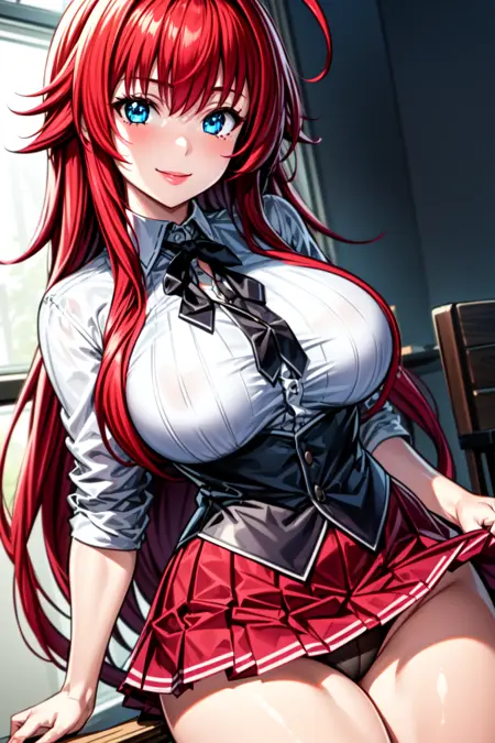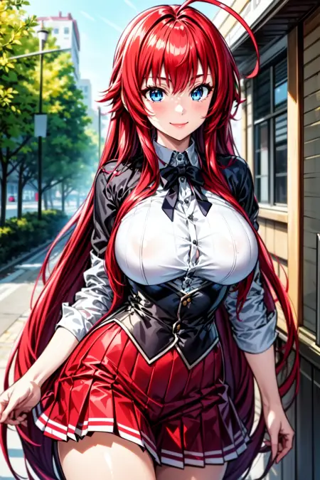 RiasGremoryNDV, 1girl, red hair, large breasts, very long hair, ahoge, blue eyes, red skirt, school uniform, shirt, corset