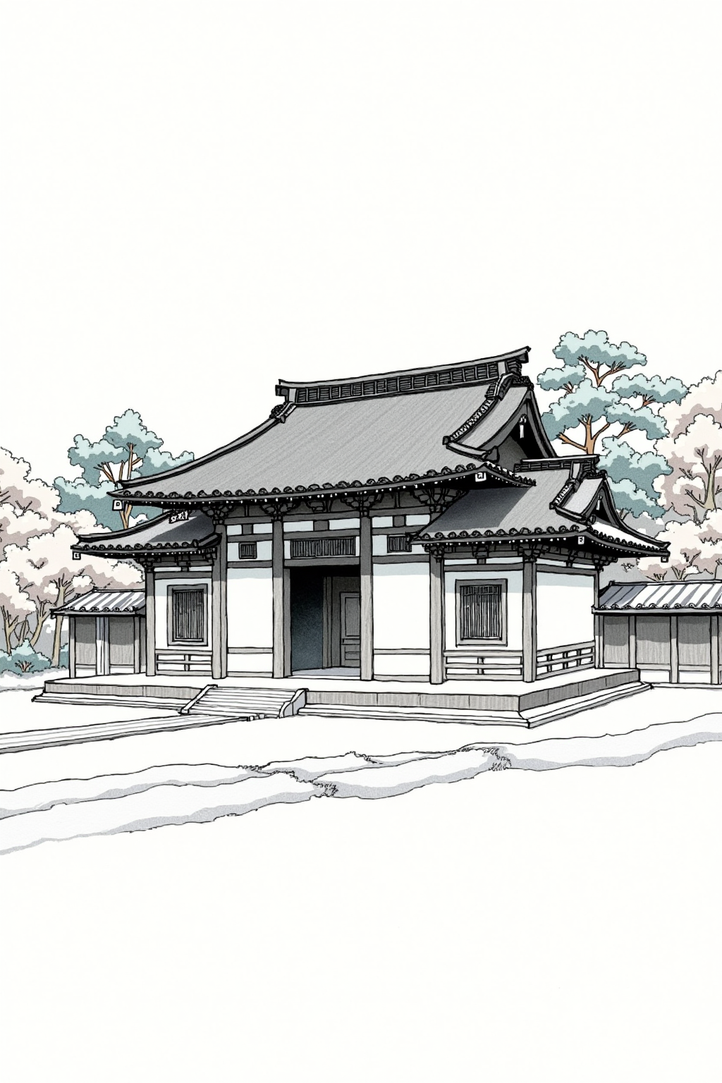 Depict traditional Japanese architecture, use a minimalist color palette, with only black, white, and gray to outline the solemnity of ancient temples.