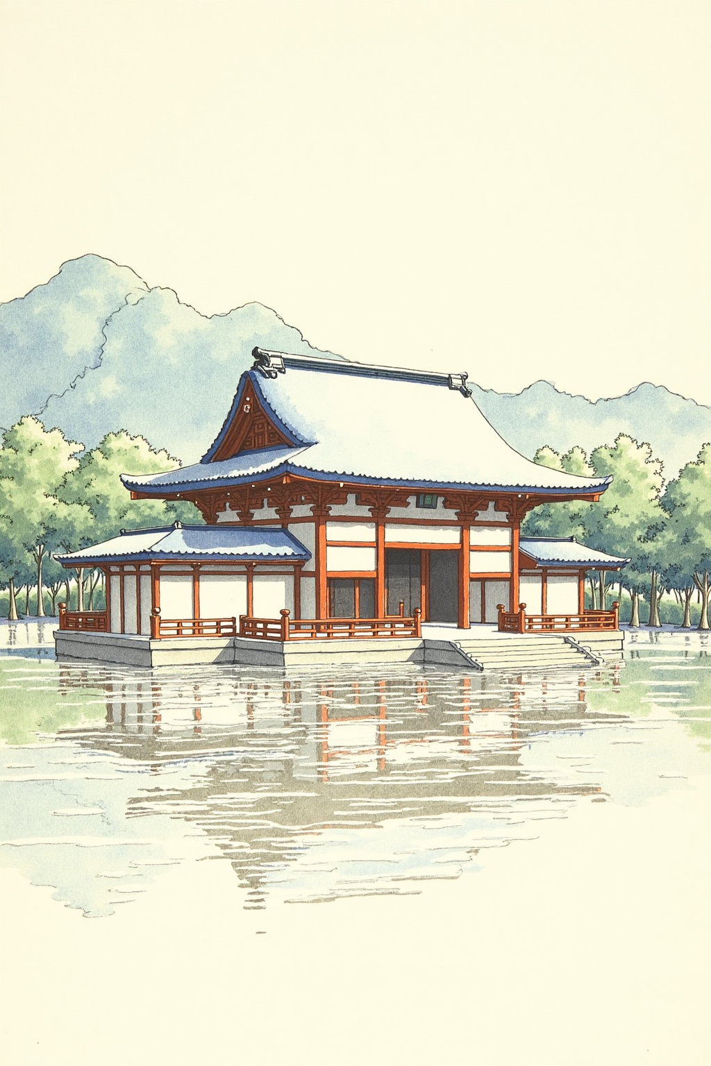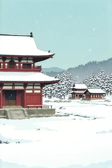 Depict traditional Japanese architecture, create a snow - scene, let snow cover pagodas and pavilions, use cool colors to express the tranquility of winter.