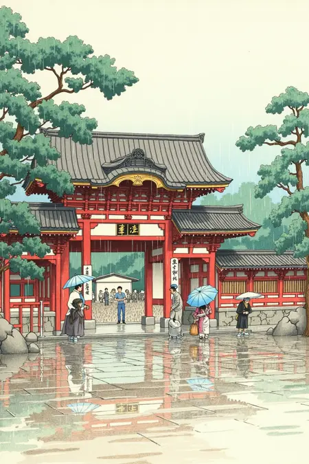 Depict traditional Japanese architecture, show the scene of people interacting with shrines, add figures with umbrellas in rainy days to reflect the integration of people and architecture.