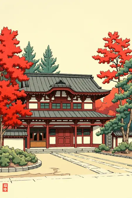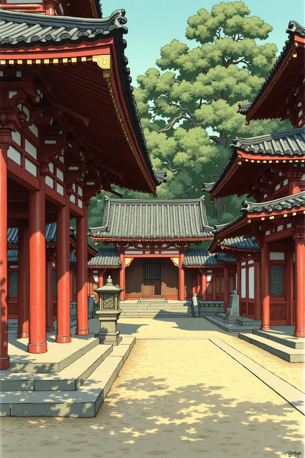 Depict traditional Japanese architecture, apply woodblock print style, highlight the red-orange tones of shrines, and present the sense of hierarchy of ancient buildings.