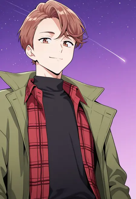1boy, male focus, solo, brown eyes, brown hair, swept bangs, black sweater, turtleneck, red shirt, collared shirt, plaid shirt, open shirt, green coat, open coat, pants, sneakers,