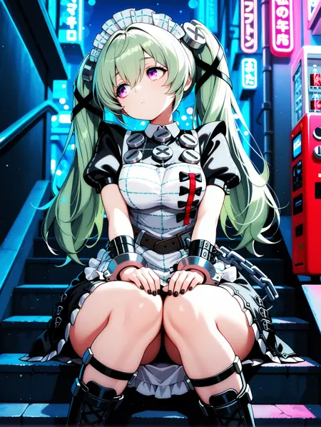 Outfit Prompts : maid headdress, dress, maid, short sleeves, apron, black dress, maid apron, puffy sleeves, frills, hair ornament, puffy short sleeves, cuffs, chain, waist cuffs, belt, hair ribbon, boots, black footwear, lace-up boots, cross-laced footwear