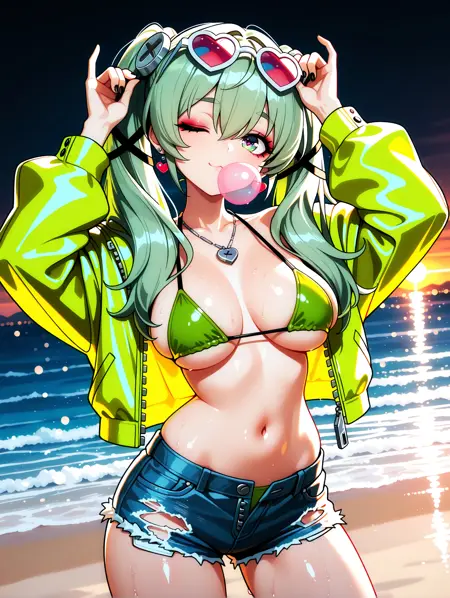 Corin Prompts : 1girl, long hair, green hair, twintails, purple eyes, bangs, hair between eyes, black nails