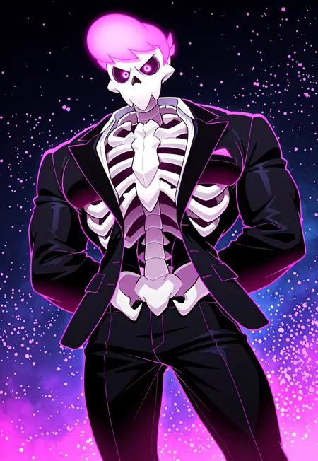 ((Skeleton, Skeleton body):1.4), (no lower jaw on the face:1.4), adult, manly, ,solo, bright vibrant pink hair, highlighted with glowing purple outlines, gloves, pink hairstyle, glowing hair, glowing eyes, black sclera, pink eyes, broad shoulders, Huge pectoral,