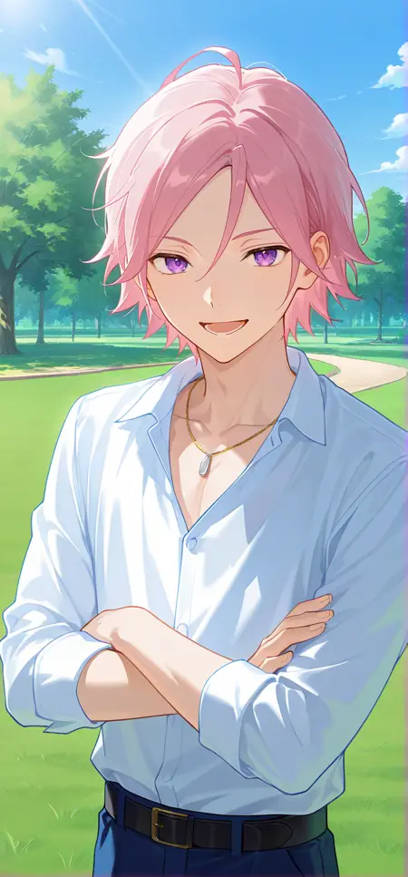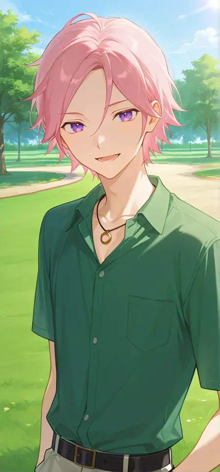 トリガーワード: oukawa kohaku、ピンクの髪、短い髪、紫の目
