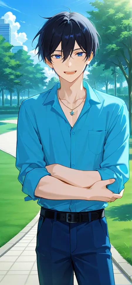 트리거 단어: hidaka hokuto, 검은 머리, 눈 사이의 머리카락, 파란 눈