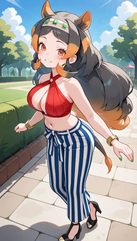 [替代服装] higo2nd,发带,头带,官方替代服装,衬衫,红衬衫,吊带装,交叉吊带,露乳,乳沟剪裁,服装开衩,无袖,无肩带,露脐装,肚脐,腰部,蝴蝶结,裤子,条纹服装,条纹裤,竖条纹服装,竖条纹裤,蓝裤,白裤,珠宝,耳环,圆环耳环,额外耳朵,项链,O型环,手镯,发圈,绿色指甲,指甲油,鞋子,高跟鞋,鞋底,凉鞋,脚趾甲,脚趾甲油,