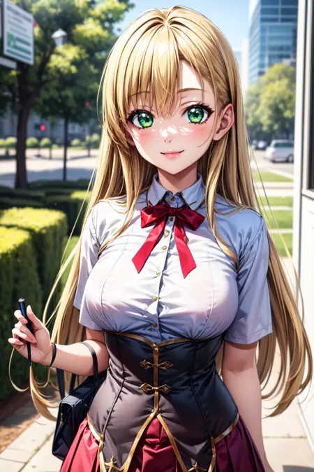 AsiaArgentoNDV, 1girl, blonde hair, large breasts, long hair, green eyes, red skirt, school uniform, shirt, corset, ribbon