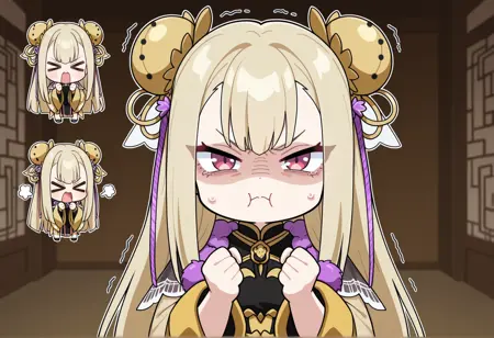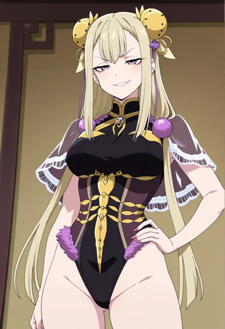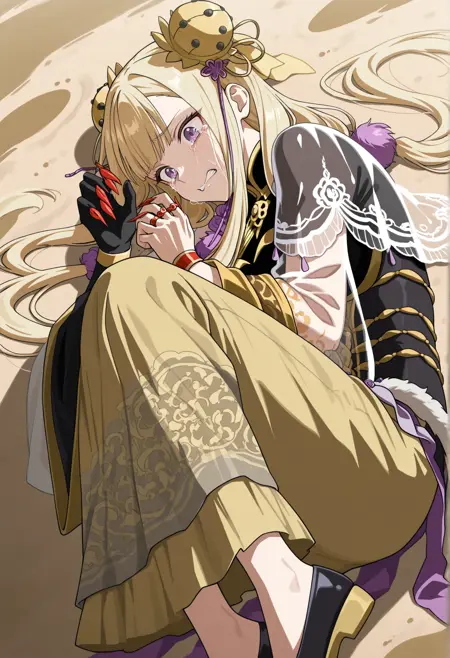注目タグ: ブロンドヘア、パープルアイ、非常に長い髪、長い横髪、二つ結び、結び髪カバー、髪飾り、中国風衣装、ジュエリー、透け感のあるカーディガン、広い袖、非対称な腕装飾、爪、片手の手袋