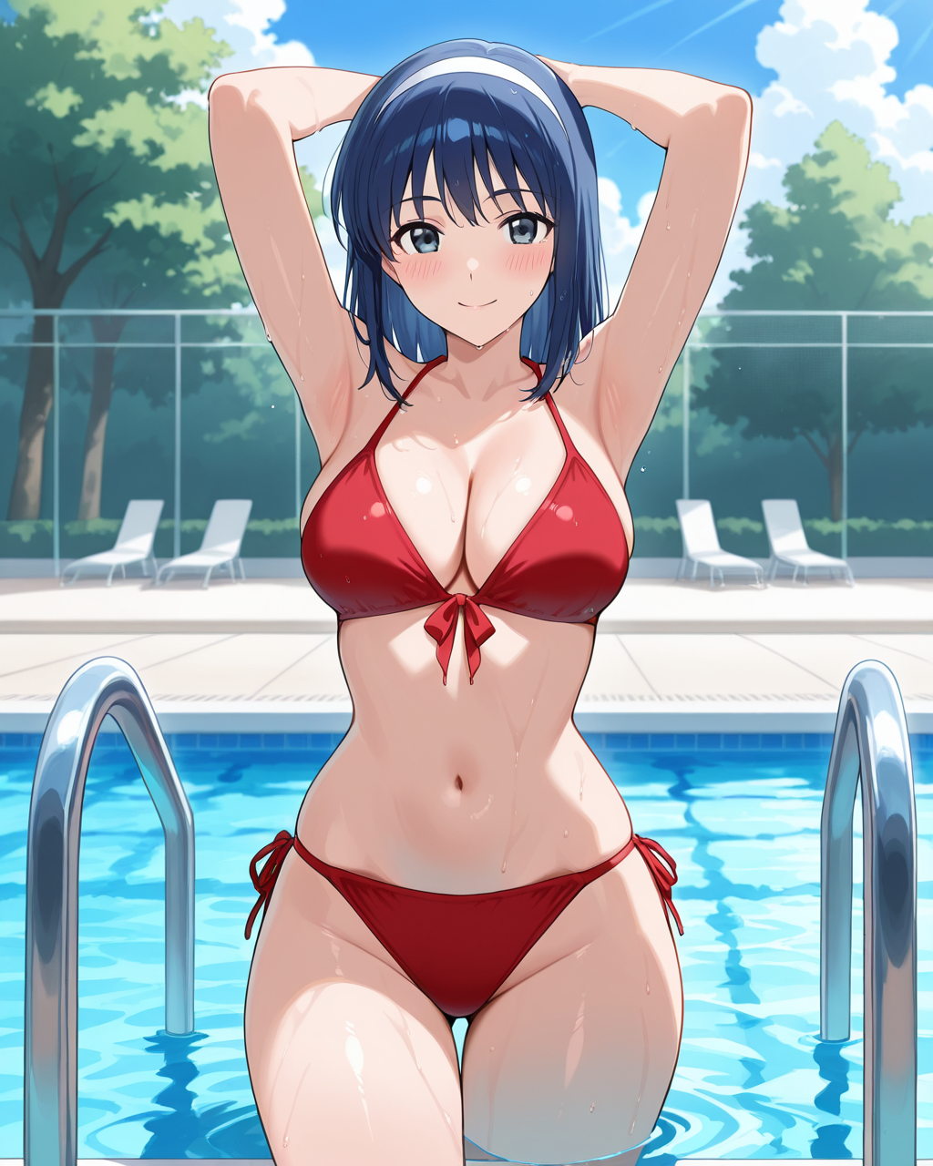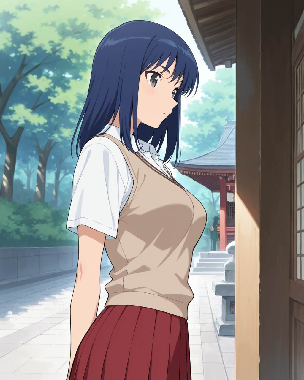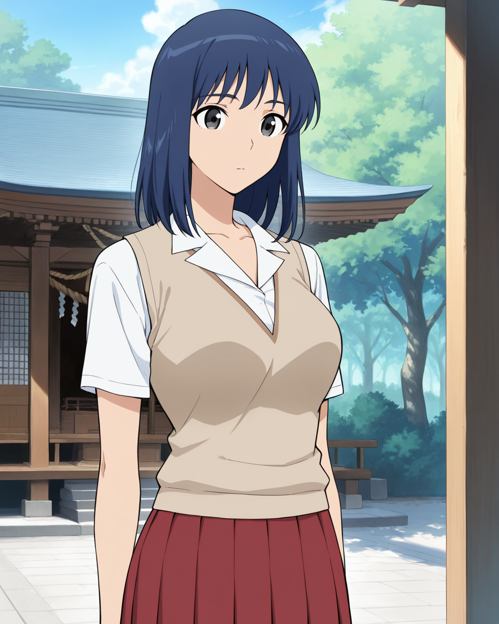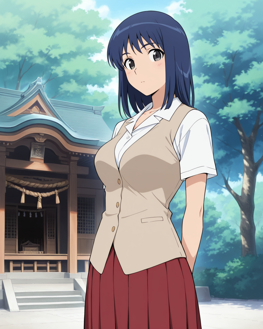 Mikoto Suo, Mikoto, Dark gray eyes, Dark blue hair, 1girl, solo, skirt, school uniform, blue hair, outdoors, tree, day, short sleeves, pleated skirt, red skirt, shirt, vest, shrine, white shirt