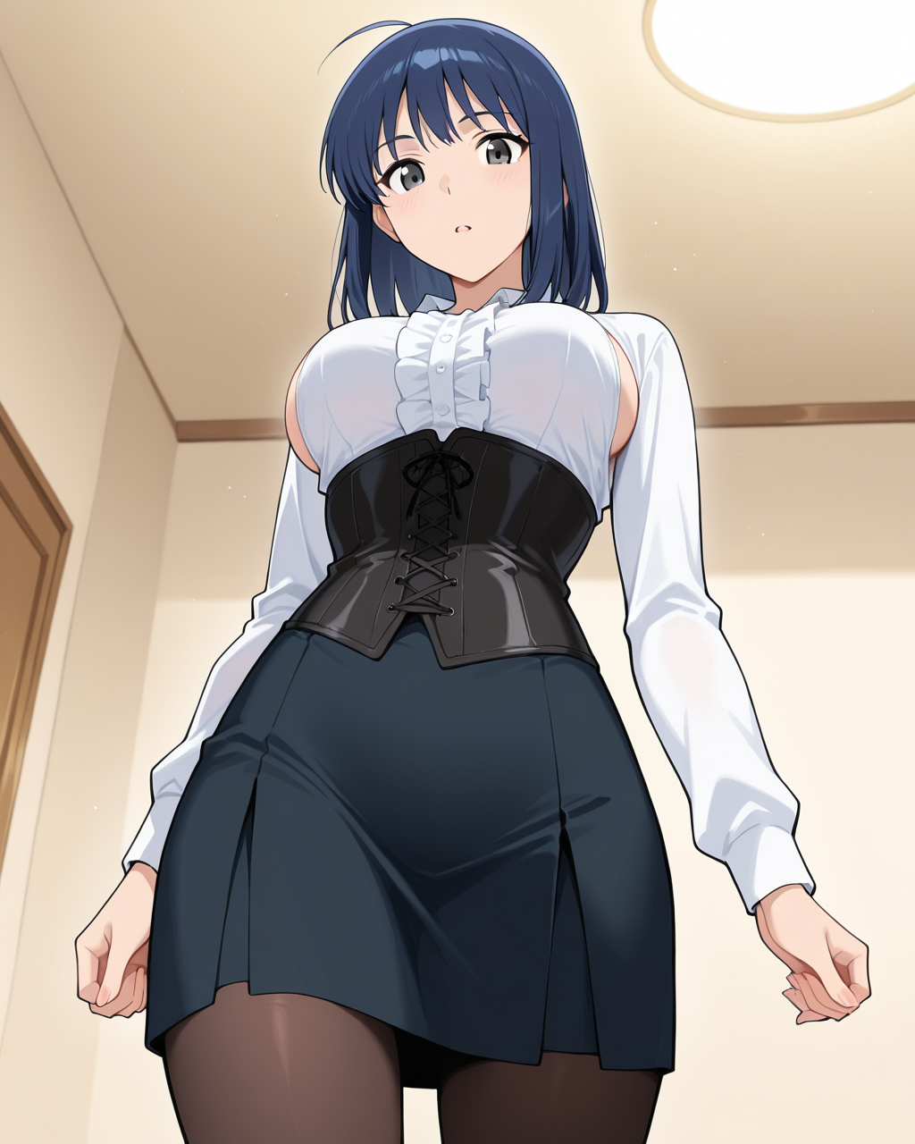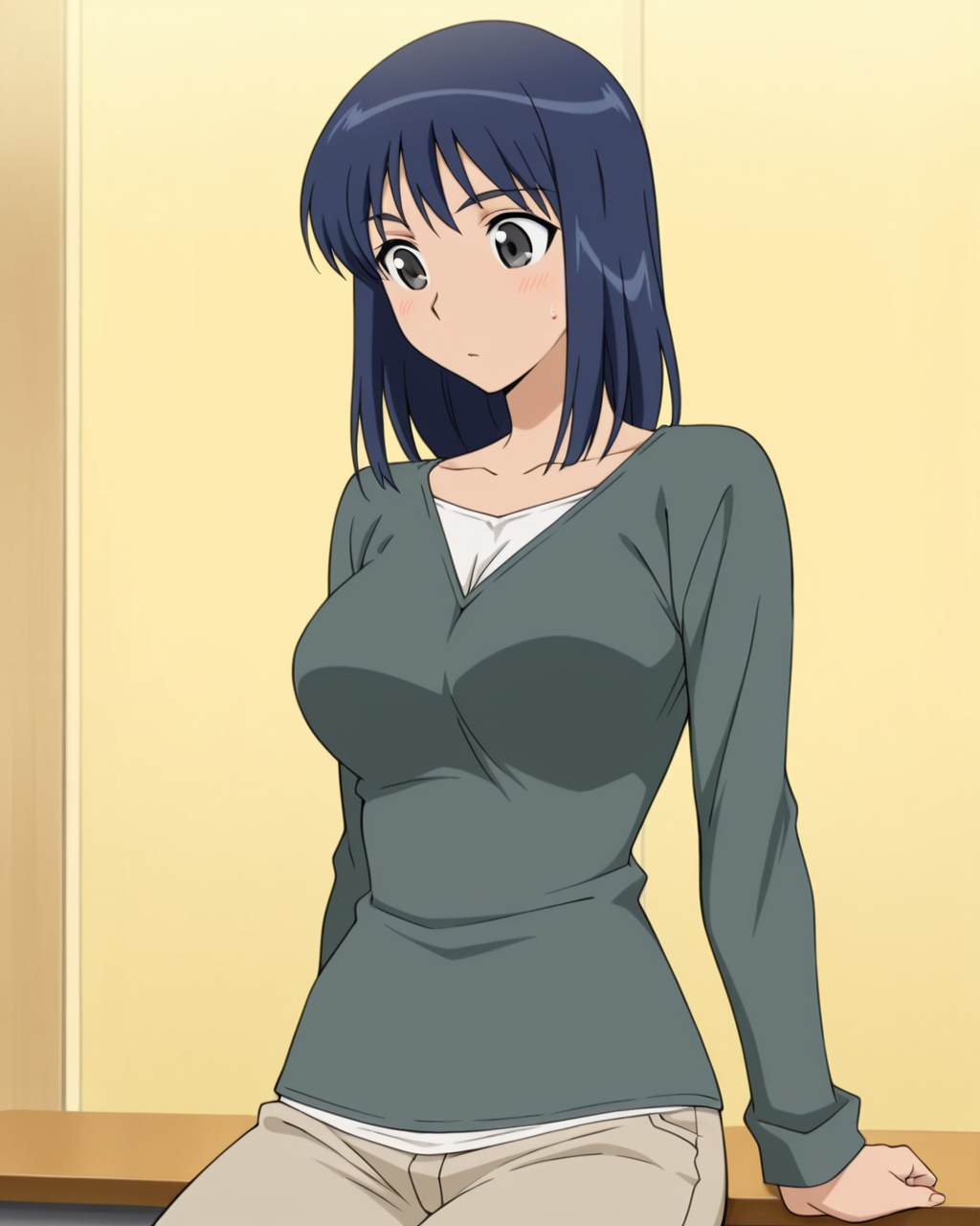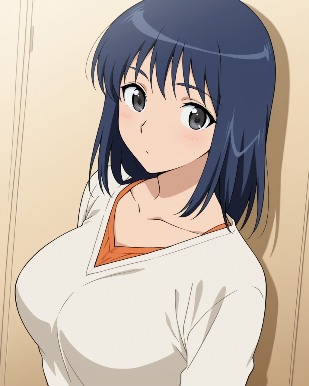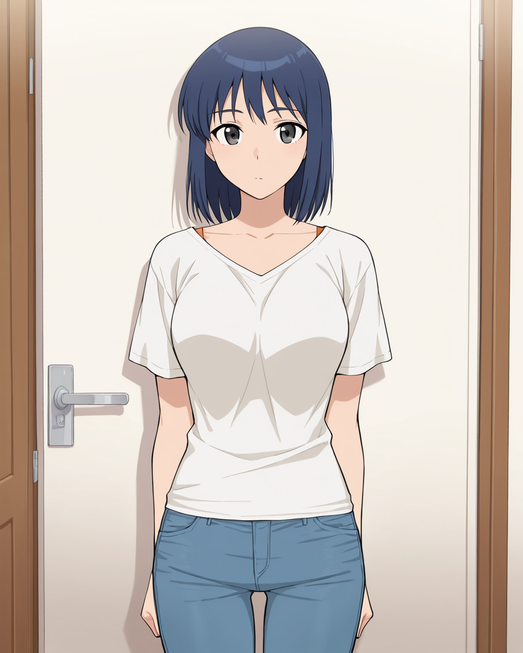 Mikoto Suo, Mikoto, Dark gray eyes, Dark blue hair, 1girl, solo, pants, shirt, door, jeans, t-shirt, short hair, short sleeves, standing, collarbone, looking at viewer, cowboy shot