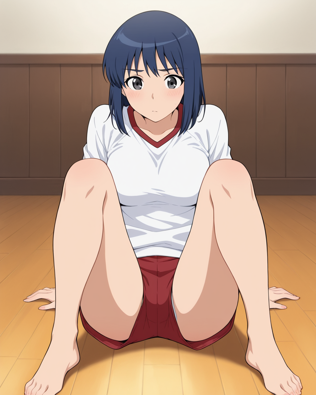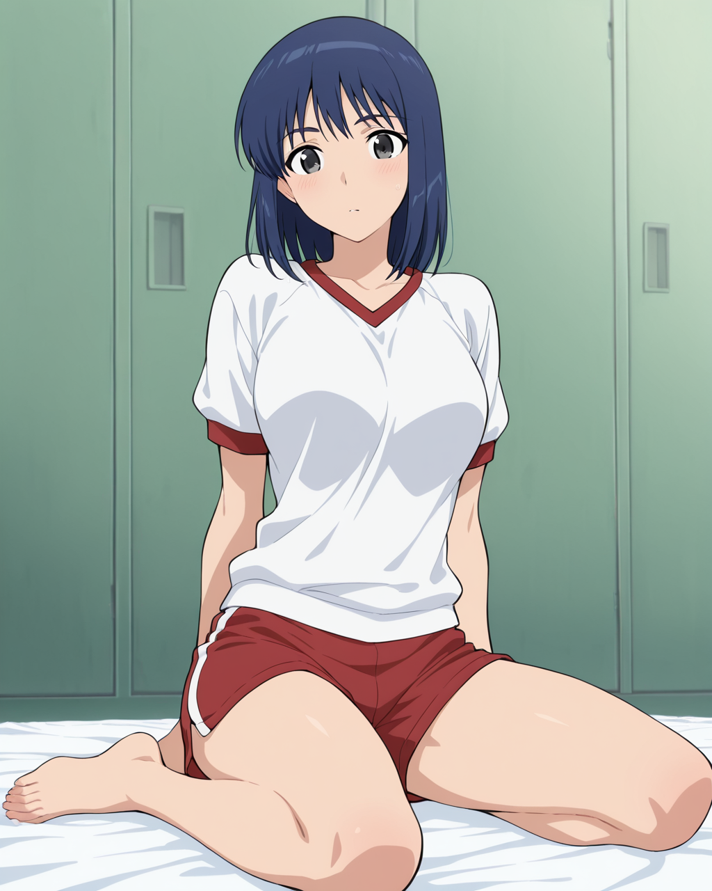 Mikoto Suo, Mikoto, Dark gray eyes, Dark blue hair, 1girl, solo, short hair, gym uniform, barefoot, shorts, red shorts