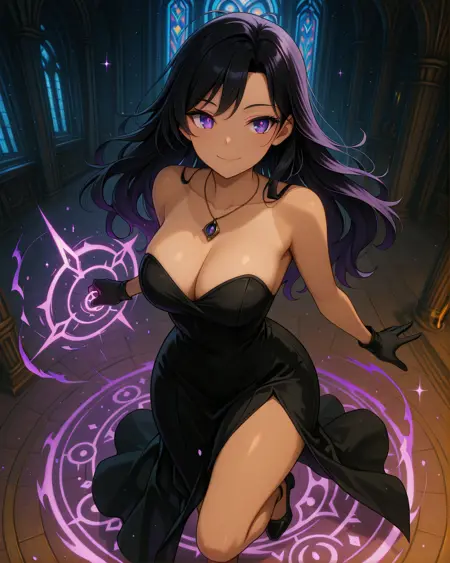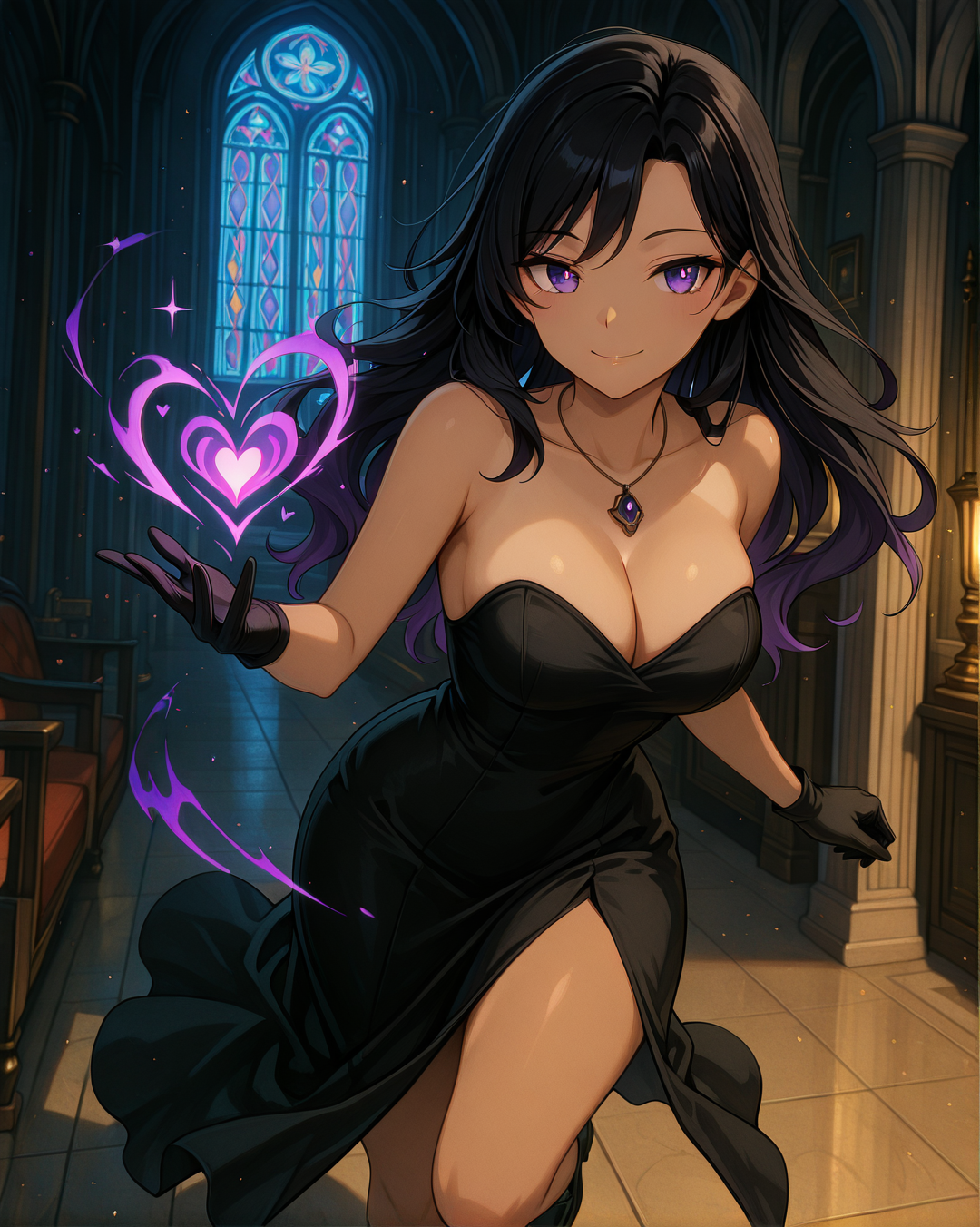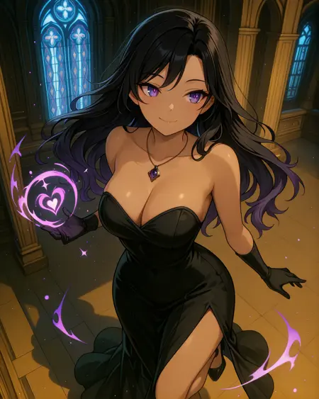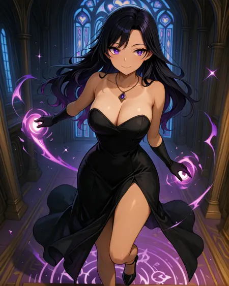 她通常身着一件迷人而灵活的黑色束胸礼服,适合潜行、诱惑或战斗。她的标志性配饰包括一条紫色宝石项链和长手套,融合了哥特式与现代女妖的美学风格。