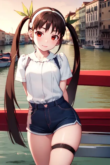 hachikuji01, 긴 머리, 갈색 머리, 붉은 눈, 평평한 가슴, 트윈테일, 머리 리본, 흰색 머리띠, 교복, 치마, 셔츠, 리본, 녹색 팔찌, 흰색 셔츠, 짧은 소매, 파란색 치마, 어깨끈, 어깨끈 치마, 별 \(기호\)