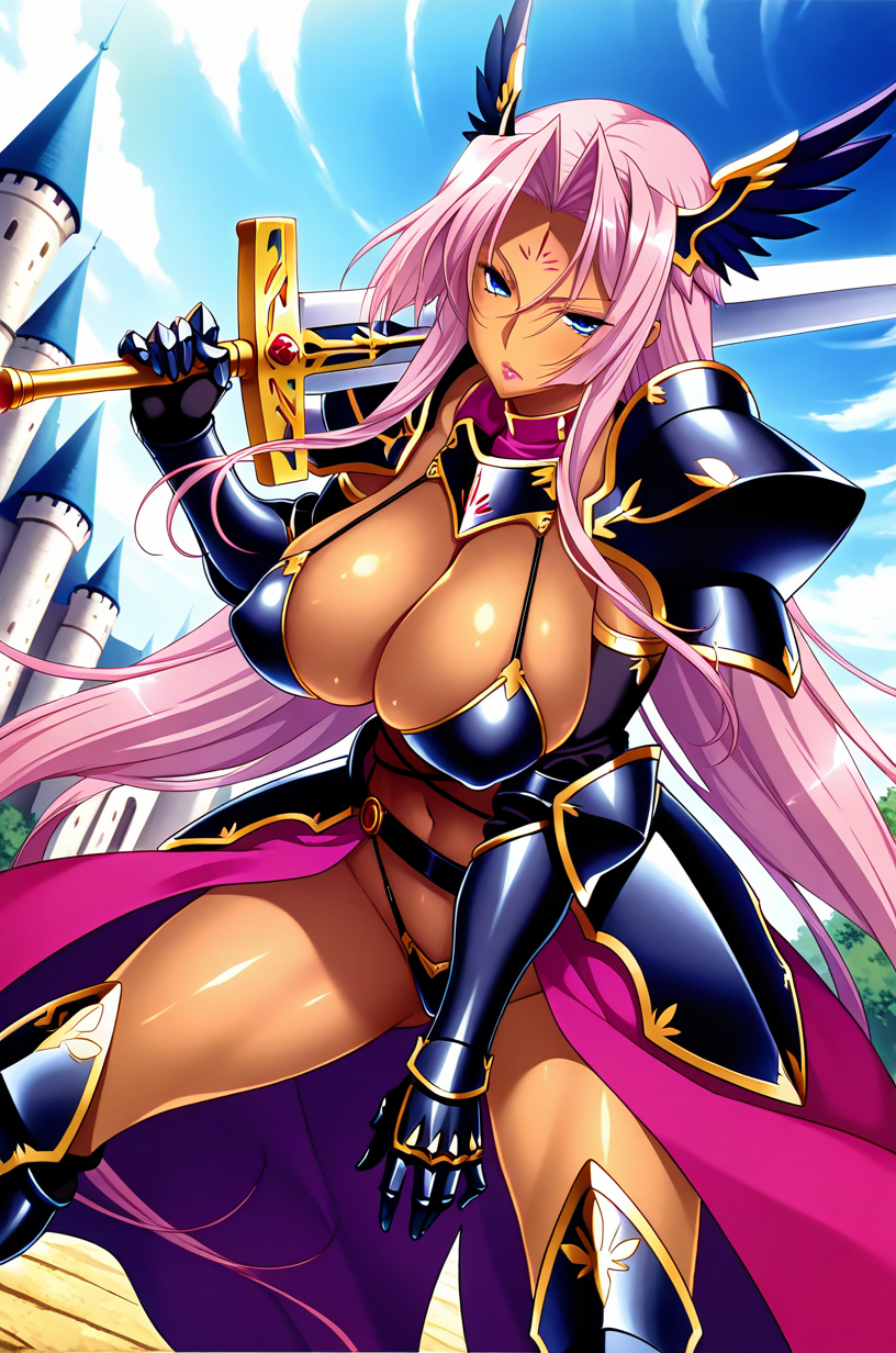 트리거 단어: s0nk3n(enr3nr3n), 성숙한 여성, 매우 긴 머리카락, 머리카락이 얼굴을 가리는 스타일, 분홍색 머리카락, 파란 눈, 메이크업, 립스틱, 검은 피부를 가진 여성, 이마의 문양
