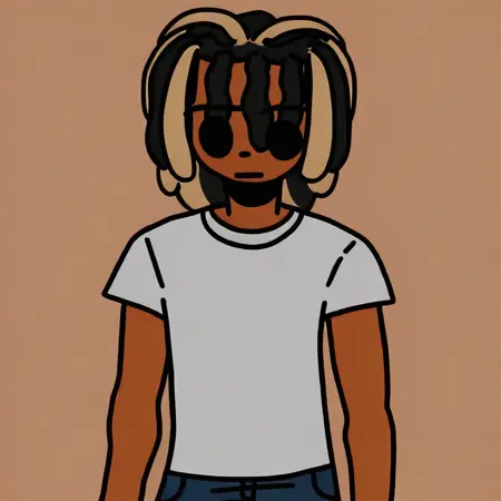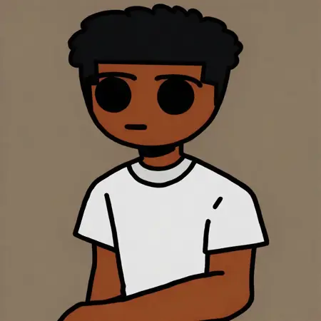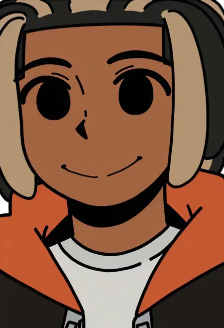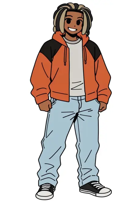 프롬프트: Jaiceation, solo, 1boy, 검은 피부, 밝은 갈색 및 검은 락, 검은 눈, 공막 없음, 검정 및 주황 후디, 그레이 셔츠, 청바지