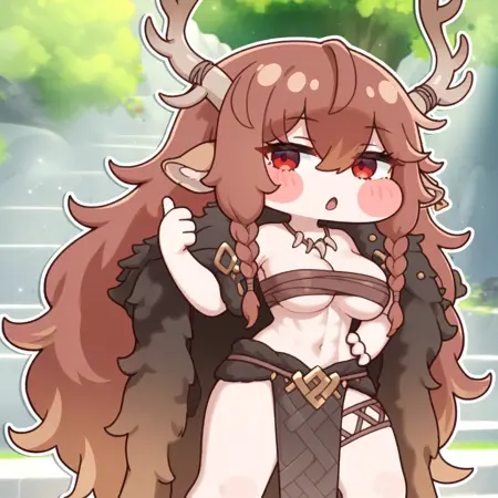 タグ:1girl、赤い目、茶色の髪、非常に長い髪、鹿の耳、鹿の角、大きな胸、歯のネックレス、へそ、編み込みの側髪、目の間の髪、毛皮のマント、胸部サラシ、腰巻き、太ももストラップ、白線、ウエストサッシュ、ちび、頬のステッカー