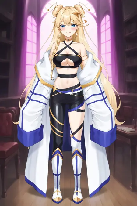 Lumi22, 1girl, 长发, 乳房, 脸红, 齐刘海, 蓝眼睛, 金发, 大乳房, 发饰, 长袖, 肚脐, 胸部露出, 裸露肩膀, 中等乳房, 锁骨, 夹克, 辫子, 耳环, 靴子, 露出衣物, 腹部, 裤子, 虚拟YouTuber, 露肩, 发髻, 露脐上衣, 袖子超过手腕, 服装镂空, 双发髻, 大腿绑带, 下胸围, 吊带颈, 黑色裤子, 胸部镂空, 白色鞋履, 白色夹克, 膝盖靴, 袖子超过手指, 白色外套, 交叉吊带, 下胸围镂空