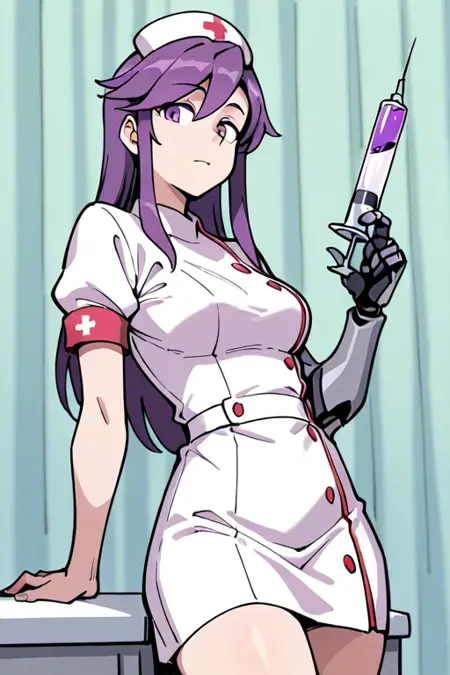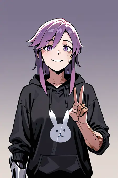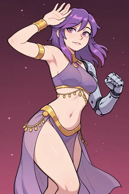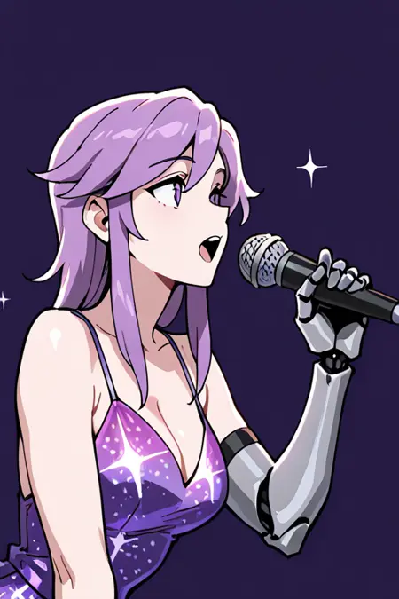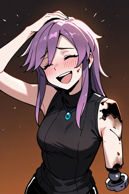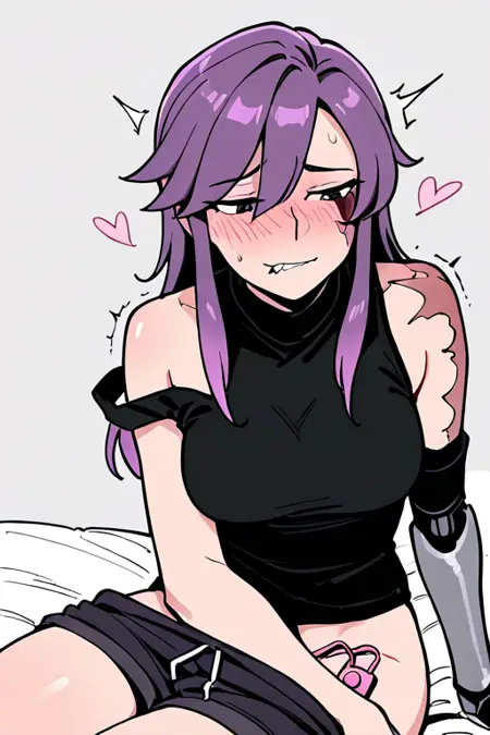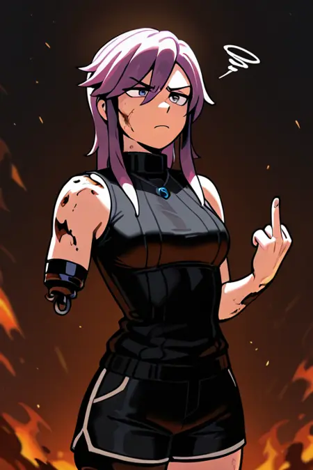 提示词:LuciniaPorter,紫色头发,品红色眼睛,单机械臂,黑色无袖毛衣,黑色背心,蓝色项链,黑色短裤,黑色筒袜,黑色靴子,