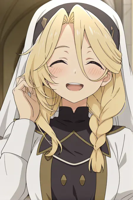 rihya, blonde hair, blue eyes, braid, hair over shoulder, veil, nun, long sleeves