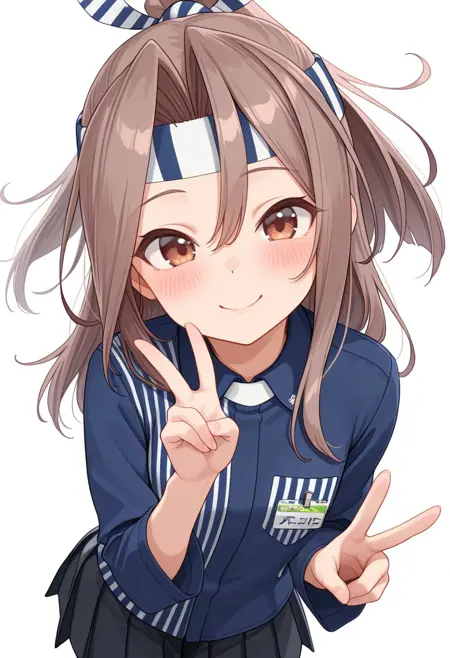 zuholawson, employee uniform, headband, hachimaki, blue shirt, vertical-striped shirt, black skirt, pleated skirt,