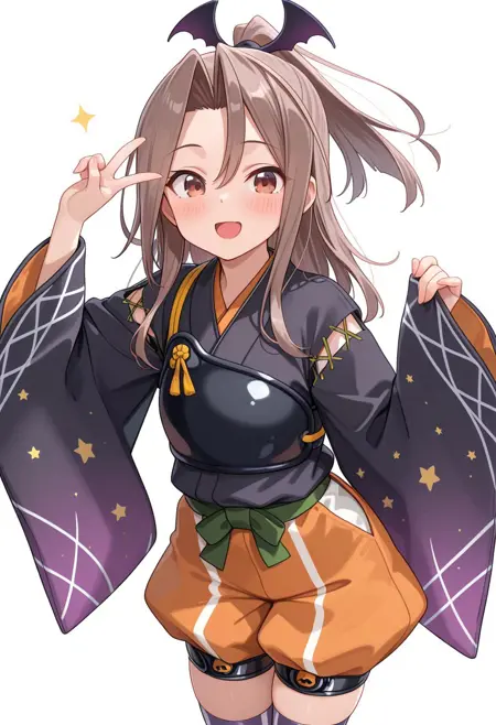 zuhohalloween, halloween costume, black japanese clothes, wide sleeves, pumpkin shorts, star (symbol), asymmetrical legwear, vertical-striped thighhighs, star print thighhighs,