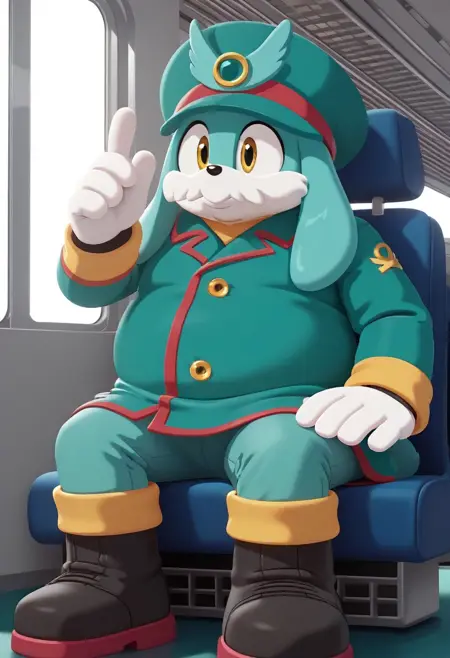 Conductor, furry, cyan fur, white muzzle, yellow eyes, pine green coat with red trim, teal hat, black boots