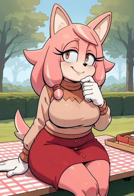 Conductor's Wife, furry, pink fur, white muzzle. amber eyes, pink tail, brown sweater, long red skirt, big breasts