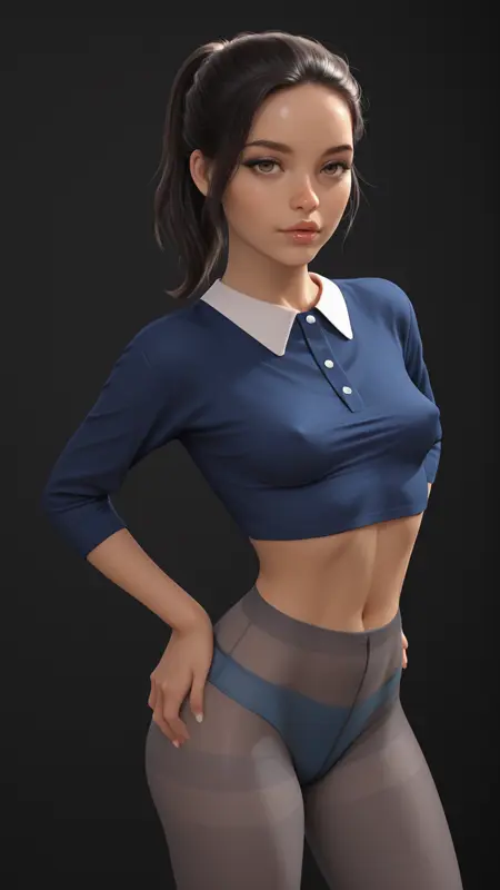口红,眼线,眼影,蓝色露脐上衣,白色衣领,白色衬衫纽扣,露腹,半透明连裤袜,灰色连裤袜,蓝色内裤,连裤袜下穿着内裤,吊袜带,吊袜带在连裤袜下方,