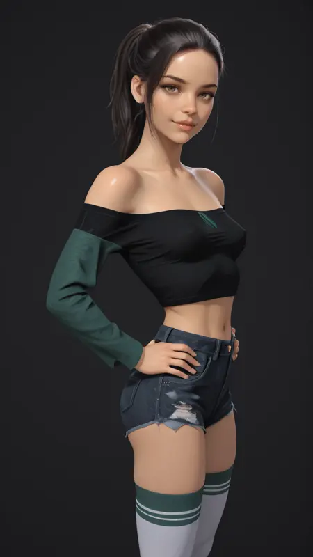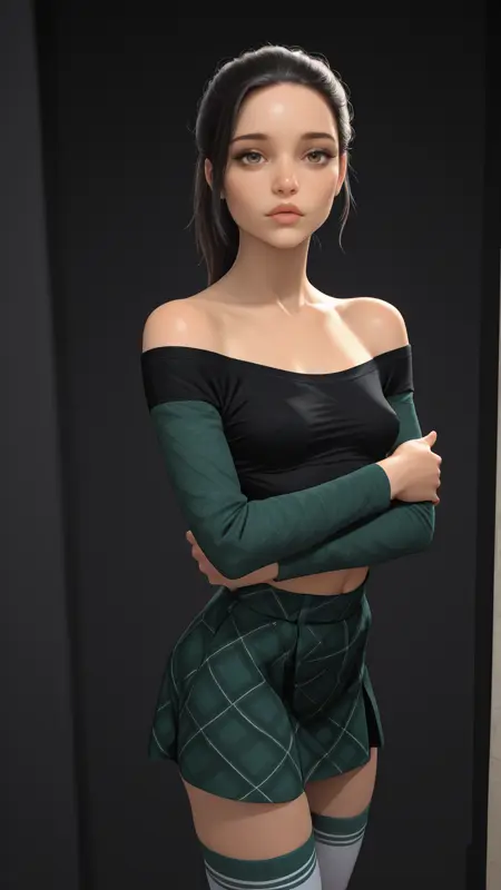 黑色露肩上衣,裸露肩膀,长袖,绿色袖子,露脐装,露腹,白色过膝袜,过膝袜顶部为绿色,
