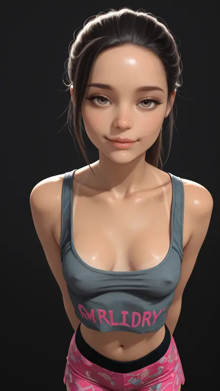 灰色背心,低胸背心,露出乳沟,背心上有粉色字体,粉色下摆,露腹,彩色运动短裤,