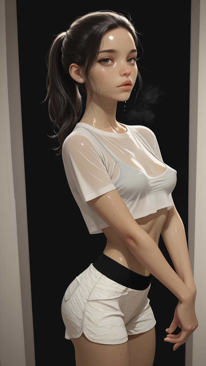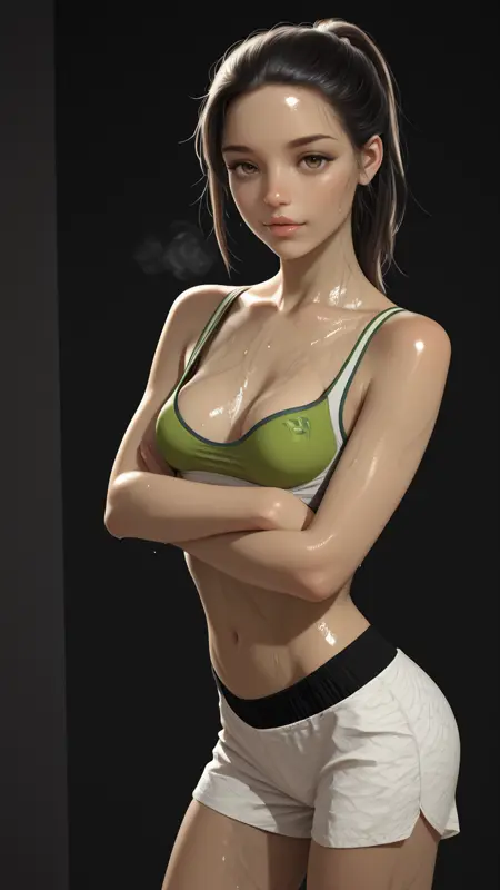 sidney_afa,黑发,榛色眼睛,嘴唇,小乳房,瘦削,马尾辫,头发向后梳,侧扫刘海,唇彩,睫毛膏,