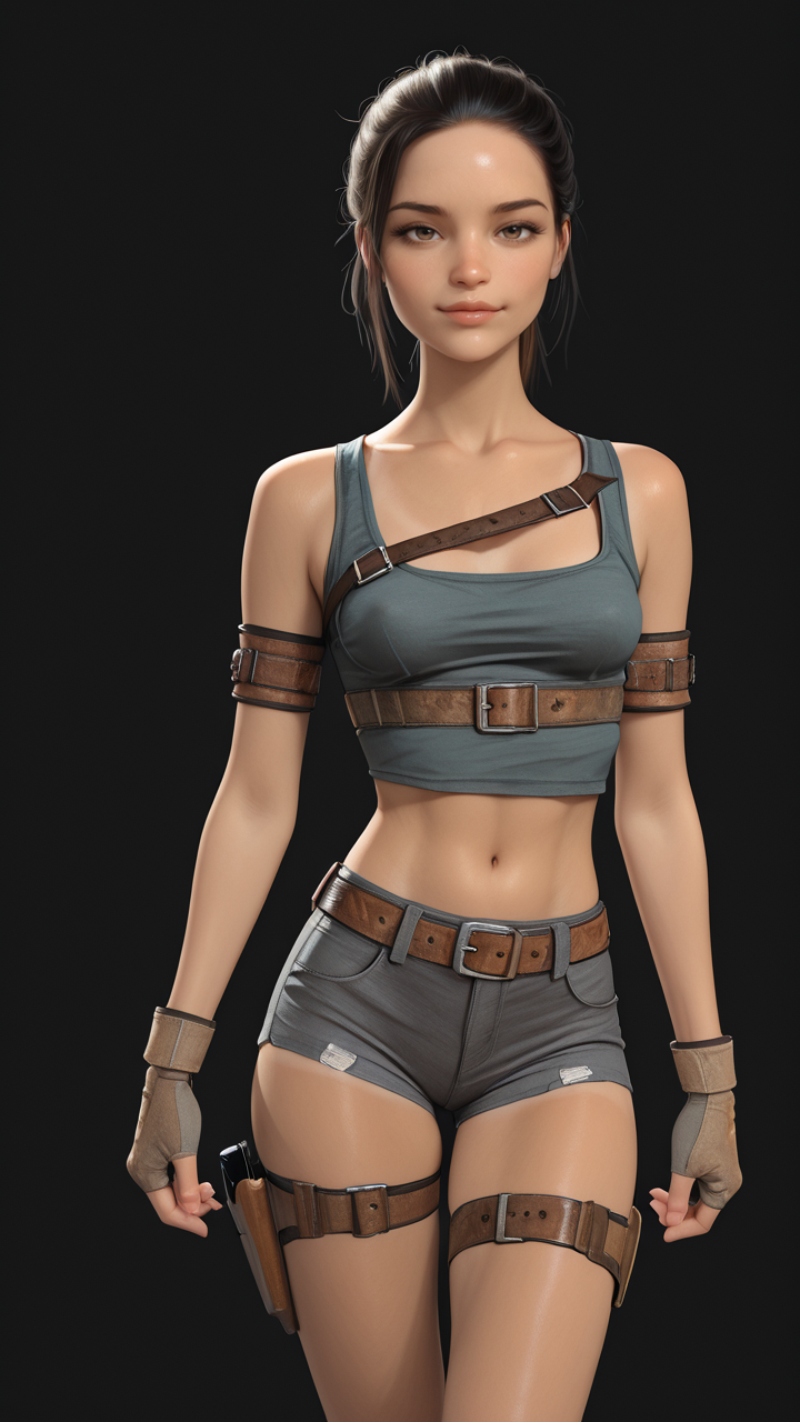 灰色背心,露脐装,露腹,灰色热裤,紧身热裤,棕色无指手套,扣式皮革臂环,扣式皮革胸带,扣式皮革腰带,棕色大腿枪套,大腿绑带