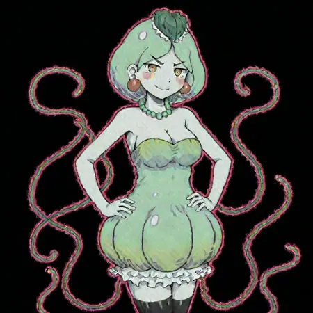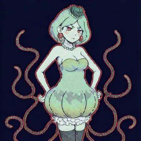 Medium Hair, Green Hair, Jellyfish Girl, Tentacles, mint colored skin, red eyes, puffy dress,big earrings, red earrings,pearl necklace, green necklace,small eyebrows,leaf on head, cute