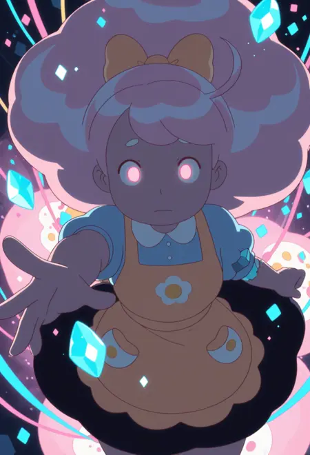 Cardamon-bapc, 어린, 보라색 머리, 파란 셔츠, 노란 학교 가방, 노란 넥타이, 분홍색 바지