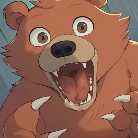 bear, bear boy, orange fur, brown eyes, black nose, tan snout, short tail, claws, fangs,