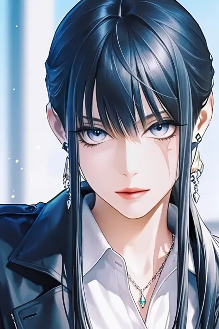 태그: rahu1, 1girl, bag, bangs, belt, black hair, black jacket, collared shirt, earrings, grey eyes, jacket, jewelry, lace-up boots, long sleeves, off shoulder, shirt, solo, standing, white shirt, black shorts, boots, jewelry, looking at viewer, scar, thighs, upper body, mature female