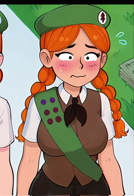 shadscout, hat, green headwear, beret, white shirt, collared shirt, short sleeves, vest, wide hips, busty, big breasts