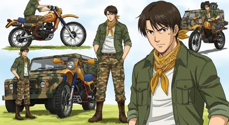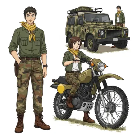 "애니메이션 스타일, 여러 설정의 만화 패널, 무작위 설정, 일러스트, 빈티지 디젤 오토바이 스즈키 XR600R, 캠플라지 랜드 로버 디펜더, 여성, 남성