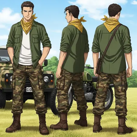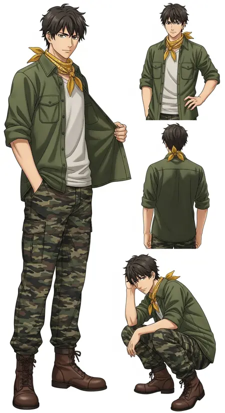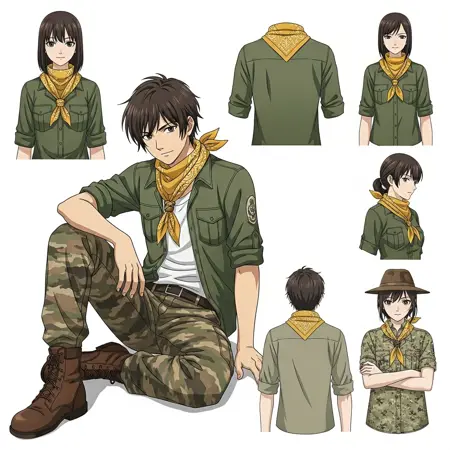 (옷차림: 노란-금빛 수건을 목에 앞쪽 매듭으로 두르고, 삼각형 모양이 뒤로 매달린 네커치프, 단추를 풀어 팔꿈치까지 접은 녹색 필드 서바이벌 셔츠, 안에는 티셔츠, 카고형 캠플라지 갈색 사바나 톤의 카고 바지, 갈색 가죽 부츠), (시점: 모든 각도에서의 역동적인 각도, 측면 각도, 뒤쪽 각도, 위에서 내려다보는 각도, 아래에서 올려다보는 각도, 근접 초점, 역동적인 자세, 왼쪽 각도)"