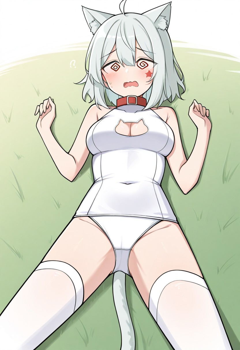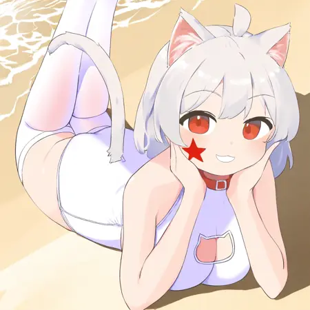 dae m18hellcat, 1girl, solo, animal ears, tail, cat ears, breasts, neckline, collar, cat tail, thighhighs, thighhigh, white swimsuit, white stockings, red star on cheek,