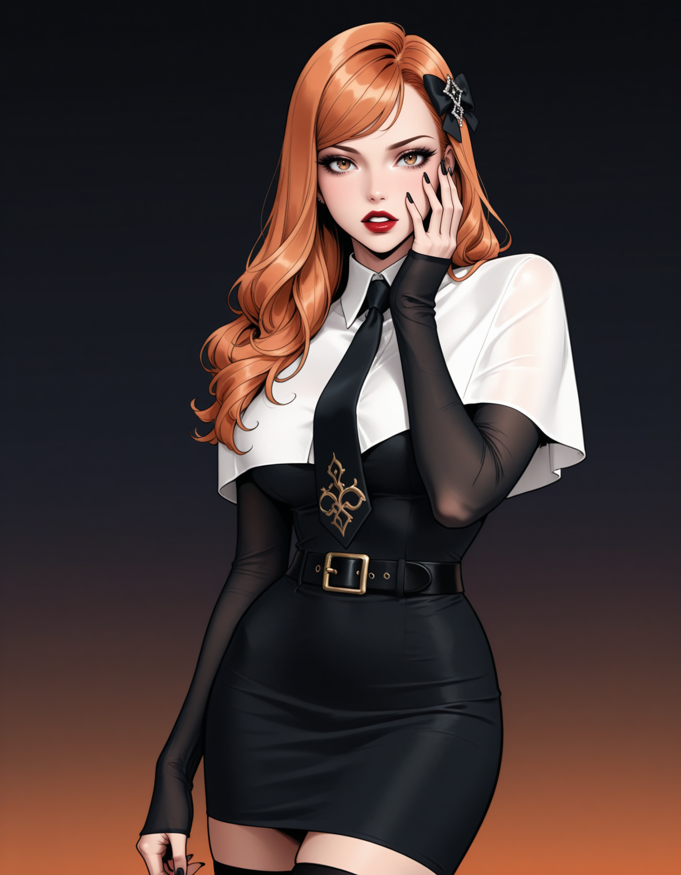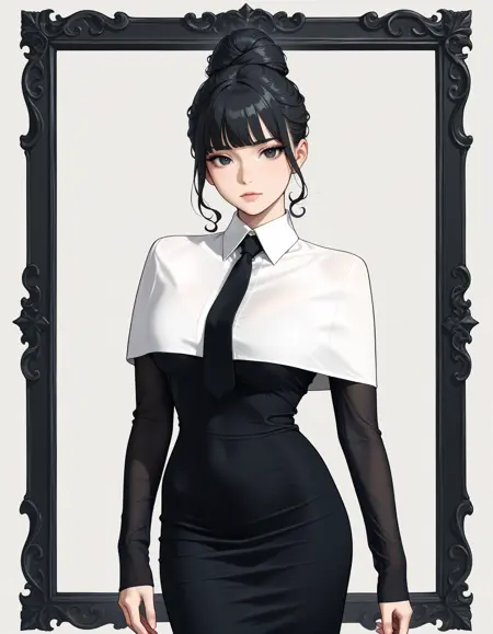 white capelet, shirt collar, black dress, see-through sleeves, sleeves past wrists, knees, strappy heels, black necktie