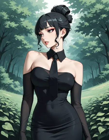 白いキャップレット、シャツの襟、黒いドレス、透け感のある袖、手首より長い袖、膝、ストラップヒール、黒いネクタイ